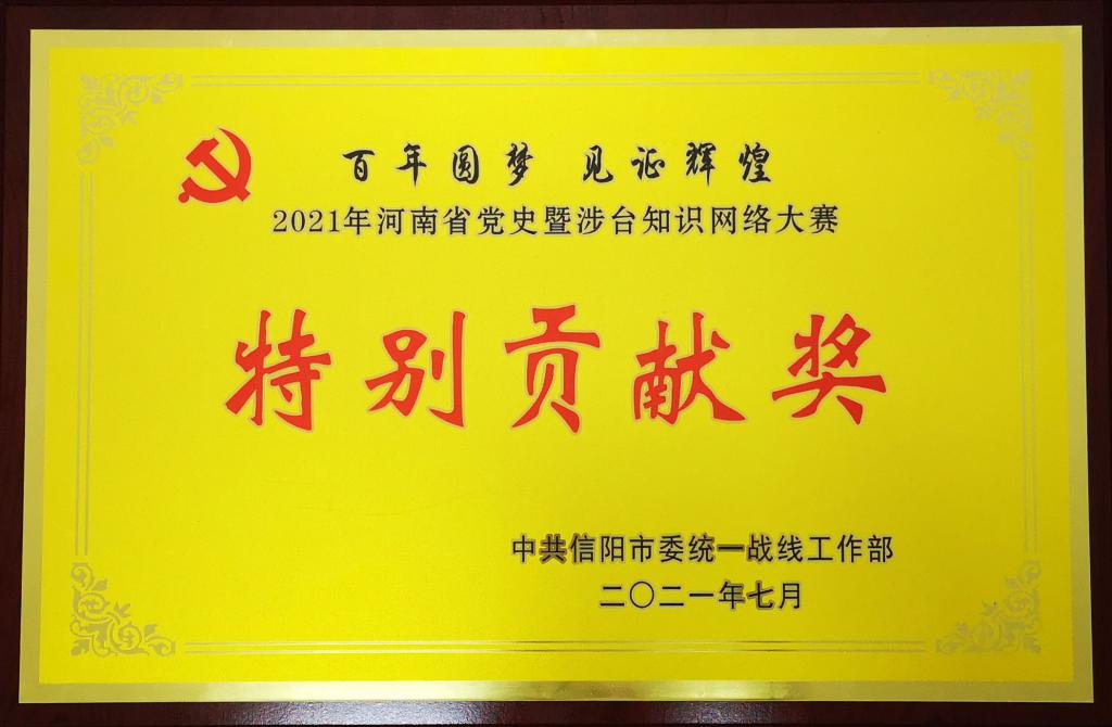 为深入贯彻落实党中央关于开展党史学习教育活动的安排部署和中央、省委对台工作精神,bat365官网积极响应河南省台办、信阳市委统战部号召,4—5月,认真组织全校师生参与“百年圆梦 见证辉煌”河南省党史暨涉台知识网络大赛活动。由于bat365官网在本次网络大赛中主动参与、组织有力、答题率高,助力信阳市稳居全省第一方阵前列,受到信阳市委统战部的高度赞扬,荣获“百年圆梦 见证辉煌”河南省党史暨涉台知识网络大赛特别贡献奖,党委统战部曾伏虎、丁舒雅荣获“先进个人”称号。