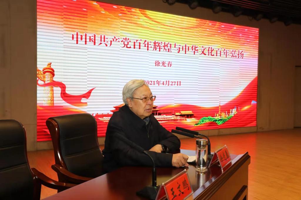 徐光春是马克思主义理论研究资深专家、中国传统文化研究著名学者、bat365官网炎黄学研究院院长,多年来一直致力于马克思主义理论、习近平新时代中国特色社会主义思想以及中国传统文化的研究与阐释,成果丰硕。报告中,徐光春以宽广的历史视野,回顾总结了中国共产党成立以来的三个光辉历程、三个伟大变迁、三个人间奇迹、十个方面的重要经验,全方位展现了我们党团结带领人民创造丰功伟绩的伟大奋斗历程。报告以辩证的历史逻辑,阐释了中华优秀传统文化为中国共产党百年辉煌提供的强大精神力量,中国共产党对其创新性发展创造的百年辉煌的伟大奇迹。以深刻的历史思考,剖析了一百年来中国共产党团结带领人民夺取伟大胜利的一个重要原因就是有坚定的文化自信。徐光春强调,进入新时代,要夺取全面建设社会主义现代化国家新胜利,仍然要始终不渝坚定文化自信,传承弘扬中华优秀传统文化,建设社会主义文化强国。