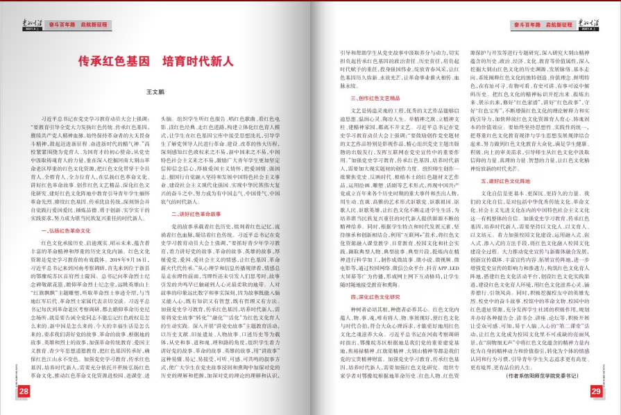 编者按:党史学习教育开展以来,学校将党史学习教育与立德树人紧密结合起来,从党史中汲取铸魂育人的精神力量,深入挖掘大别山革命老区厚重的红色文化资源,在弘扬红色革命文化、讲好红色革命故事、创作红色文艺精品、深化红色文化研究、建好红色文化阵地中教育引导青年学生传承红色基因,成长为堪当民族复兴重任的时代新人。校党委书记王文鹏在《党的生活》第6期以《传承红色基因 培育时代新人》为题对bat365官网党史学习教育的育人成效进行了专题报道。