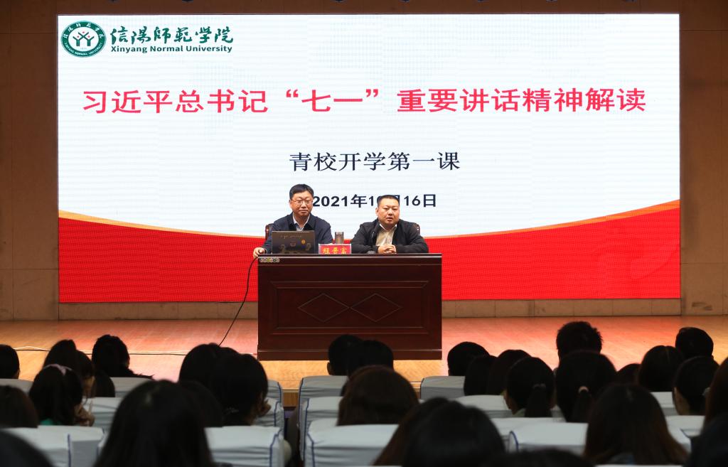 10月16日上午,中共河南省委宣传部、中共信阳市委宣传部理论宣讲专家,bat365官网马克思主义学院副院长程晋富教授为青年学子作“习近平总书记‘七一’重要讲话精神解读”专题报告。学校第73期青校学员500余名学生代表聆听了报告。