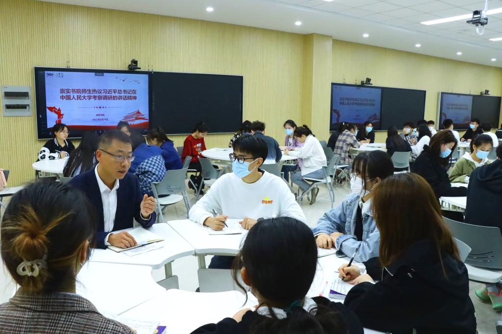 五四青年节即将到来之际,习近平总书记来到中国人民大学考察,深情寄语广大青年牢记党的教诲,立志民族复兴,不负韶华,不负时代,不负人民,在青春的赛道上奋力奔跑,争取跑出当代青年的最好成绩。习近平总书记重要讲话在崇实书院引起强烈反响,4月28日,该院师生在淮河校区智慧教室开展专题学习研讨,深入学习讲话精神。教工党支部成员及学生入党积极分子参与研讨学习。