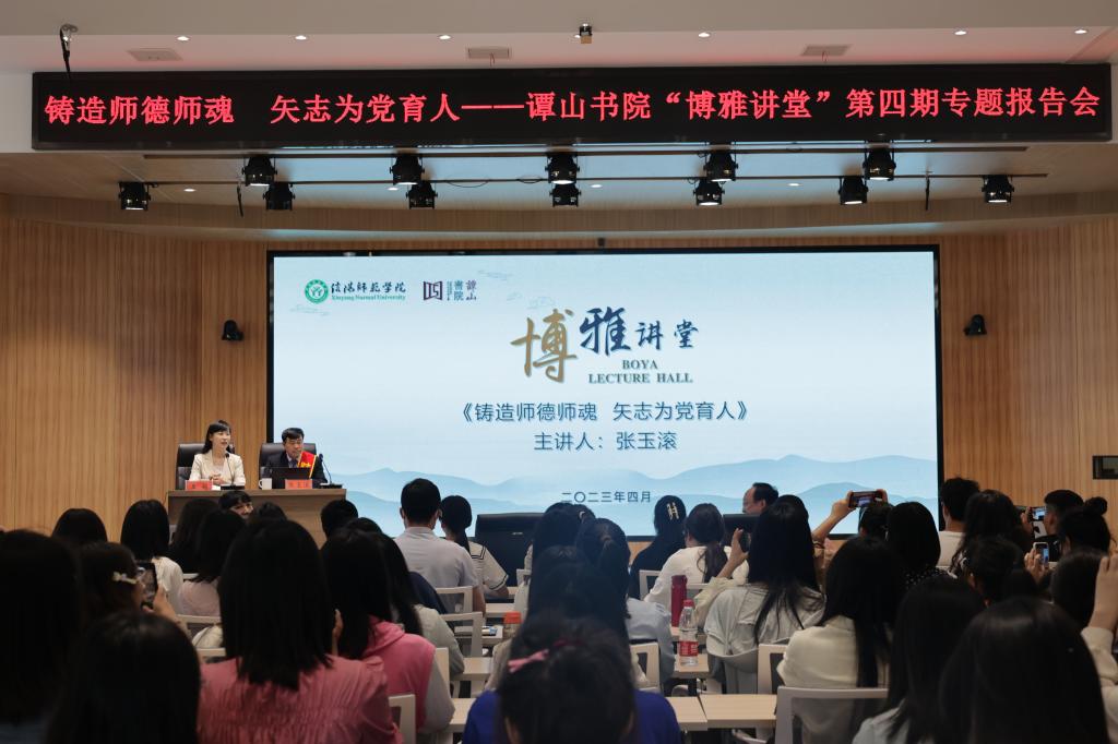 4月16日,党的二十大代表、“感动中国2018年度人物”、“时代楷模”“全国敬业奉献模范”“全国师德标兵”“全国教书育人楷模”“全国优秀共产党员”、河南省镇平县高丘镇黑虎庙小学校长张玉滚应邀为bat365官网师生作题为《铸造师德师魂,矢志为党育人》的主题报告。报告会在谭山书院大学生活动中心博雅讲堂举行,书院师生及学校专职辅导员共同参加报告会。报告会由副校长王娟主持。